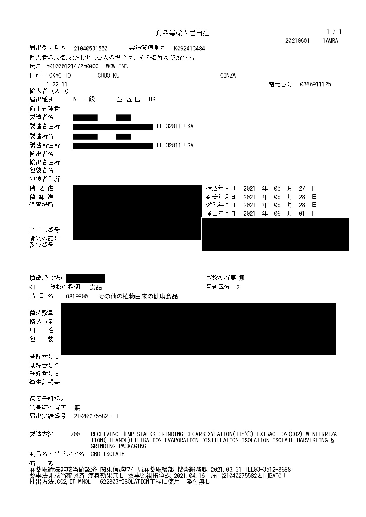 向精神作用のあるTHC(テトラヒドロカンナビノール)の使用は日本で禁止されています。CBD製品にTHCが含まれていないことを証明するため、必ず製造工場とは別の第三者機関にて成分検査を実施したCBDを使用しています。当社は、厚生労働省の許可を得て、通関した正規輸入の原料のみを使用した製品を提供しています。